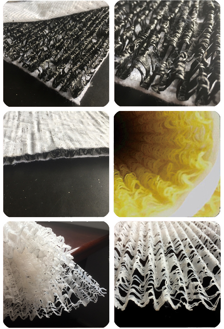 与无纺土工布复合后,能在掩埋的封闭覆盖层之下,将汇集渗透过土壤覆盖层的雨水或堆场本身排放的污水,利用其独特的排水功能,按照工程要求从土工席垫夹层中有序排放,而不会形成淤堵,因此可以避免因土壤覆盖层吸水饱和而产生可能的滑动问题;与两层无纺土工布、通过热粘合形成具有反滤、排水、保护功能。