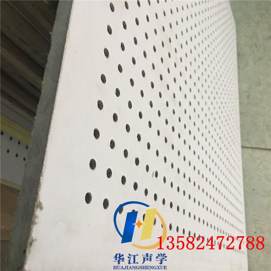 2)产品性质与用途。由于板面穿孔,能吸收声波能量。通过不同孔径、孔距、穿孔率及孔腔的组合能有效调整室内混响时间,对低频声波的吸收尤为显著。特殊配方、特制基材,能满足强度要求。孔形多样、组合丰富,可根据吸声及装饰需要进行不同选择。采用干法作业,工期短,施工便捷,经济高效。饰面工序简易,可直接滚涂涂料。